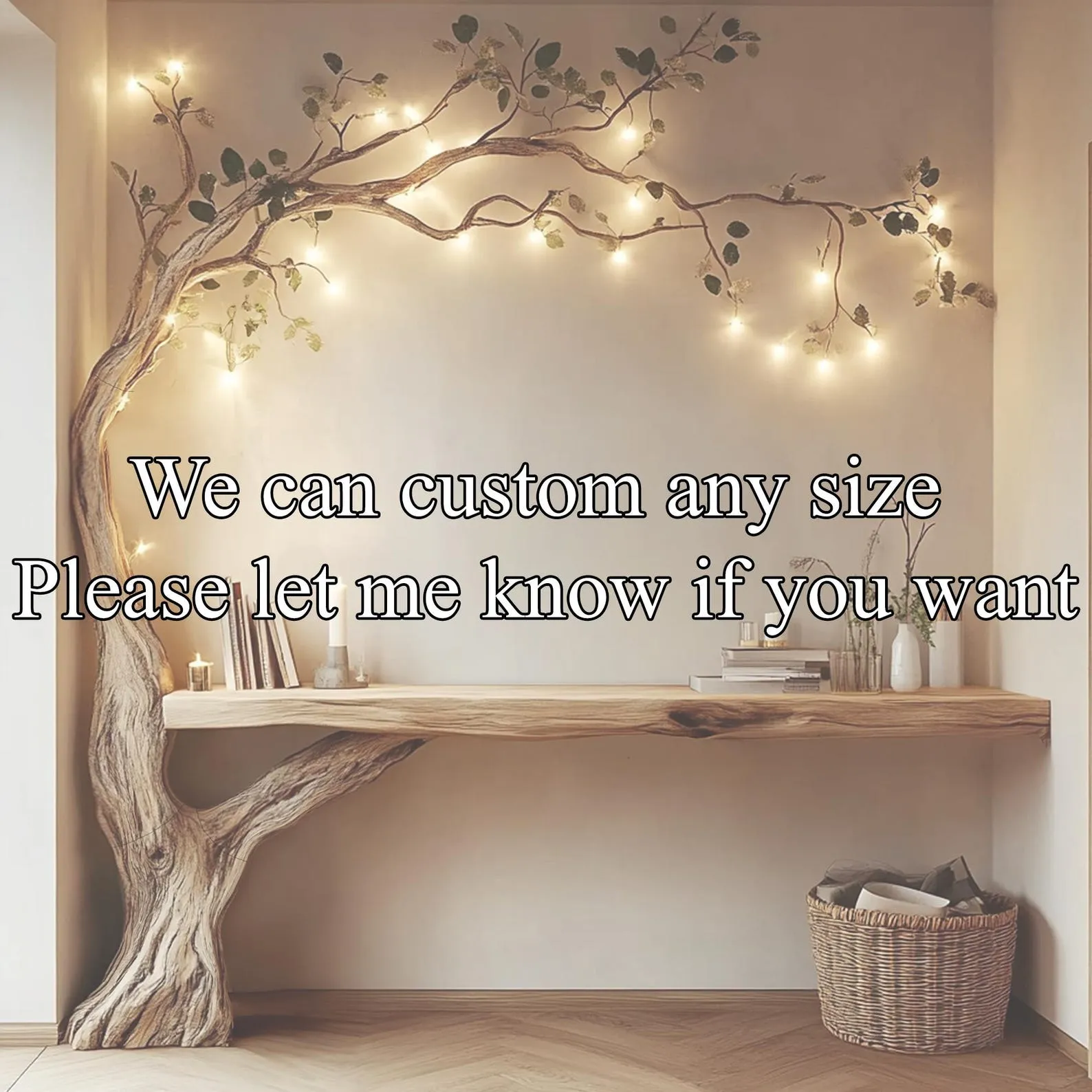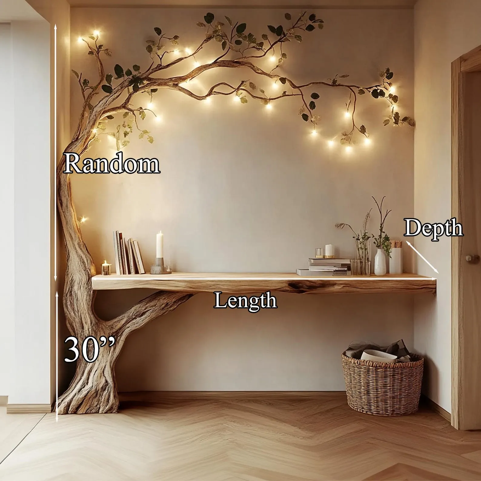 The piece suits rustic, boho and contemporary interiors, pairing well with woven textiles, metal lighting and neutral or earth toned walls. Use the upper branches for novels and decor while keeping the tabletop relatively clear for functional items, letting the tree shape remain visible.