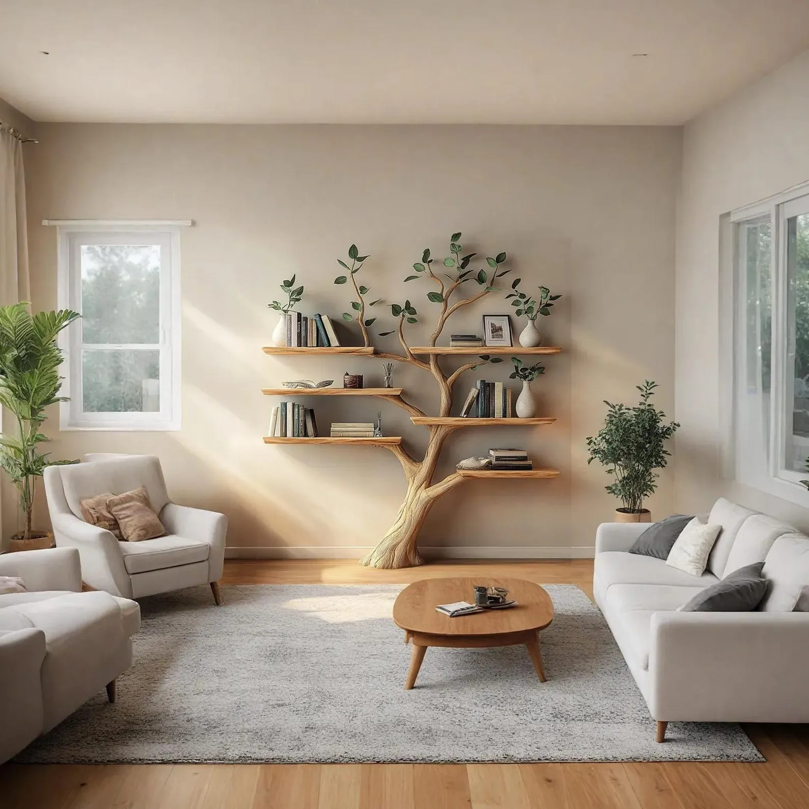 The solid wood tree shaped wall mounted bookshelf brings playful structure and functional storage to living spaces. Its trunk and branch layout creates multiple short shelves that hold books, toys and decorative items without occupying floor area, making it well suited to childrens rooms, reading corners and compact apartments.